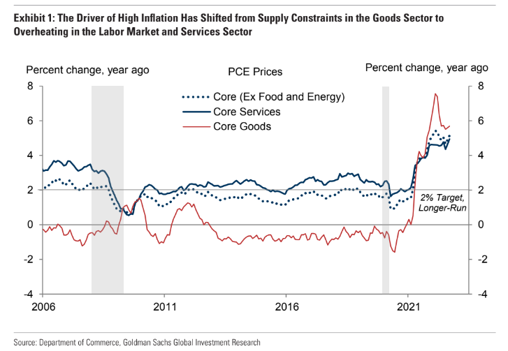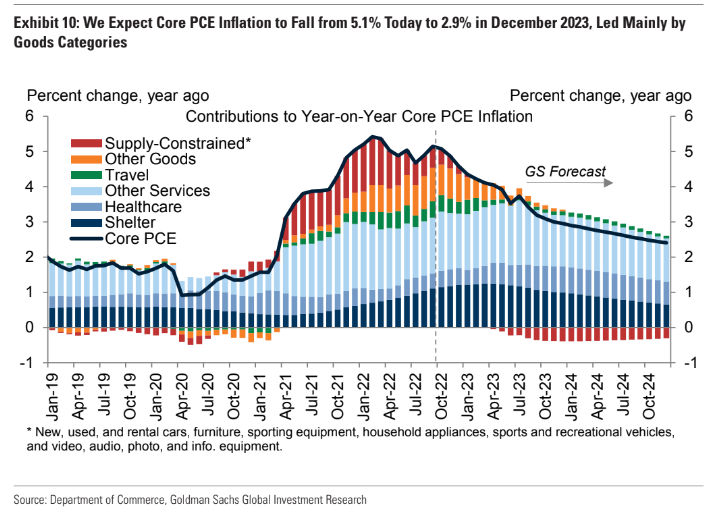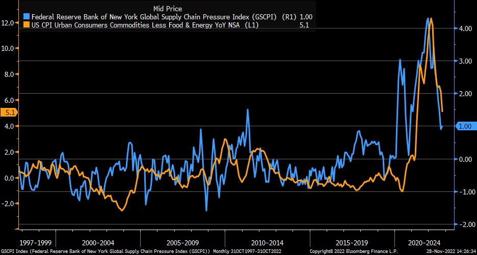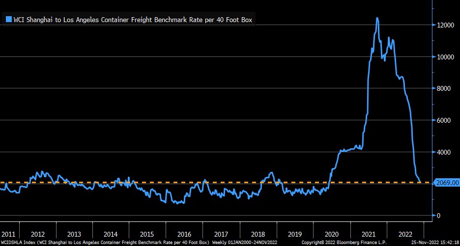 車に限らず、消費財はサプライチェーン制約の影響で価格が高騰してきたが、そのサプライチェーン制約は一時的なものであり、2022年半ばにはかなり修復されている。上海~ロサンゼルス間の貨物コンテナ運賃は米国内で生産能力でカバーできない物を中国から輸入する需要の旺盛さを象徴していたが、一時6倍になったのが既に2018~2019年の水準まで戻っている。それに連動する形でFedのサプライチェーン・プレッシャー指数も緩和しており、コア財価格はそれに遅行して下がって来た。そもそもサプライチェーン制約が直らなくても、(コストの多くを賃金が占めるサービス業はともかく)消費財価格は毎年同率以上の伸び率で値上がりし続ける動力がないため、少なくともYoYで見た時の財価格の高騰は一時的(Transitory)に決まっているのである。ましてやサプライチェーンがいつか修復されるとなれば、消費財はデフレに転落するか転落しないかだけの議論になってくる。