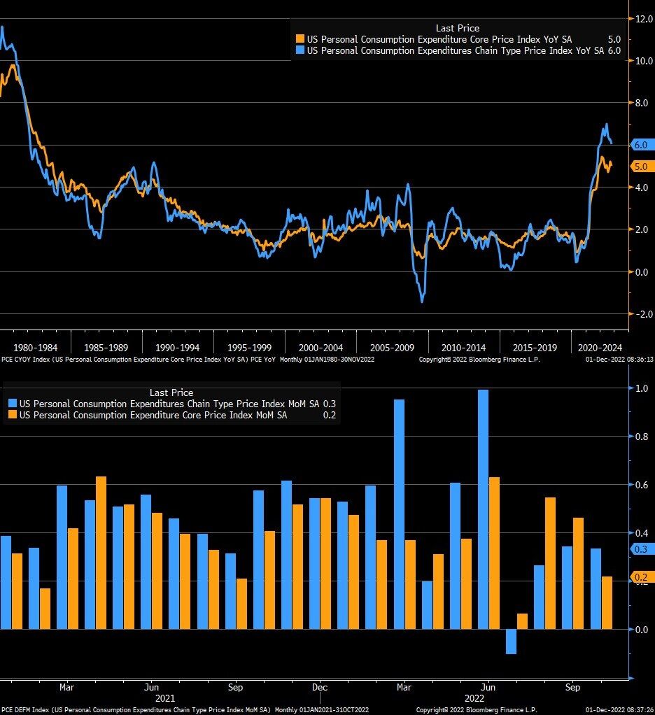 更に上流から見た生産者物価(PPI)などは2022年春から減速が始まっている。夏までは消費者物価もこれに遅行しているだけなのでインフレはもう終わりと思われていたのが、9月以降インフレのコア化でもう一相場やっている。いずれにしろ、ここまで来るとインフレ3指標とも揃ってピークアウトが明瞭になっている。全体像としては、サービスや家賃のインフレは相変わらず粘着的であるが、少なくともその上に上乗せされていた消費財のインフレは一時的(Transitory)であったことが確定している。サービスインフレがだいたい4%を構成しているので、前者はコアCPIやコアPCEの4%近辺からの下がり方がかなり長い期間にわたって極めて緩慢になることを示唆しているが、それはあくまでも将来の4%近辺での話であり、話の雰囲気をだけ持ち帰って、例えば来年CPIがYoYで現水準近辺で粘着するのではないか、などと言い出すのは無知を晒け出すものである。もちろんその無知とパウエルFedの退化が上手く共鳴した場面も今年何度もあったが、それはあくまでも僥倖である。