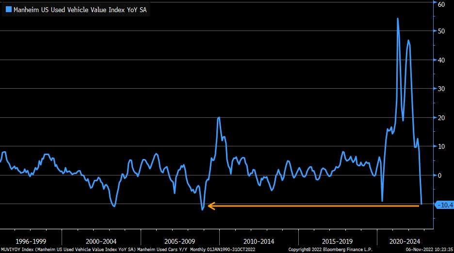 中古車価格はマンハイム中古車価格指数が先行指標となる。マンハイムは企業同士のオークション価格から算出しているため、(エンド需要の影響を受ける)小売り価格に伝播するのに2ヶ月とも言われるタイムラグがあり、今年の大半の時間帯はマンハイムを見てCPIガチャにチャレンジしてもあまりよいことがなかった。中古車価格は更に新車価格に半年弱先行するとされている。