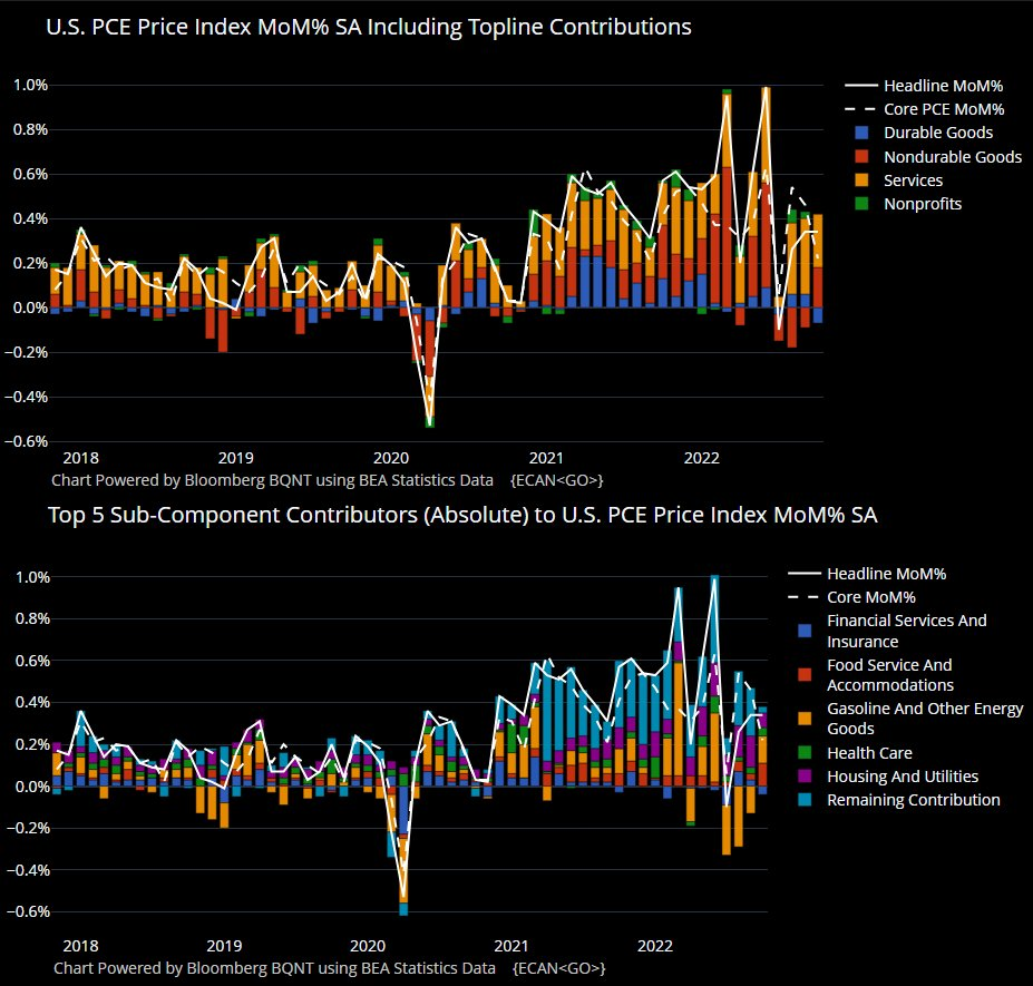 Fedがより重視する米個人消費支出(PCE)価格では、(商務省の統計であり、労働省労働統計局と異なり)医療保険の計算方法がCPIと異なるため10月改訂から始まる医療保険デフレは見られない。しかしこちらも10月分は医療保険デフレ抜きでも減速している。中身ではPCEもCPIと同様、サービスが堅調で消費財が減速している。