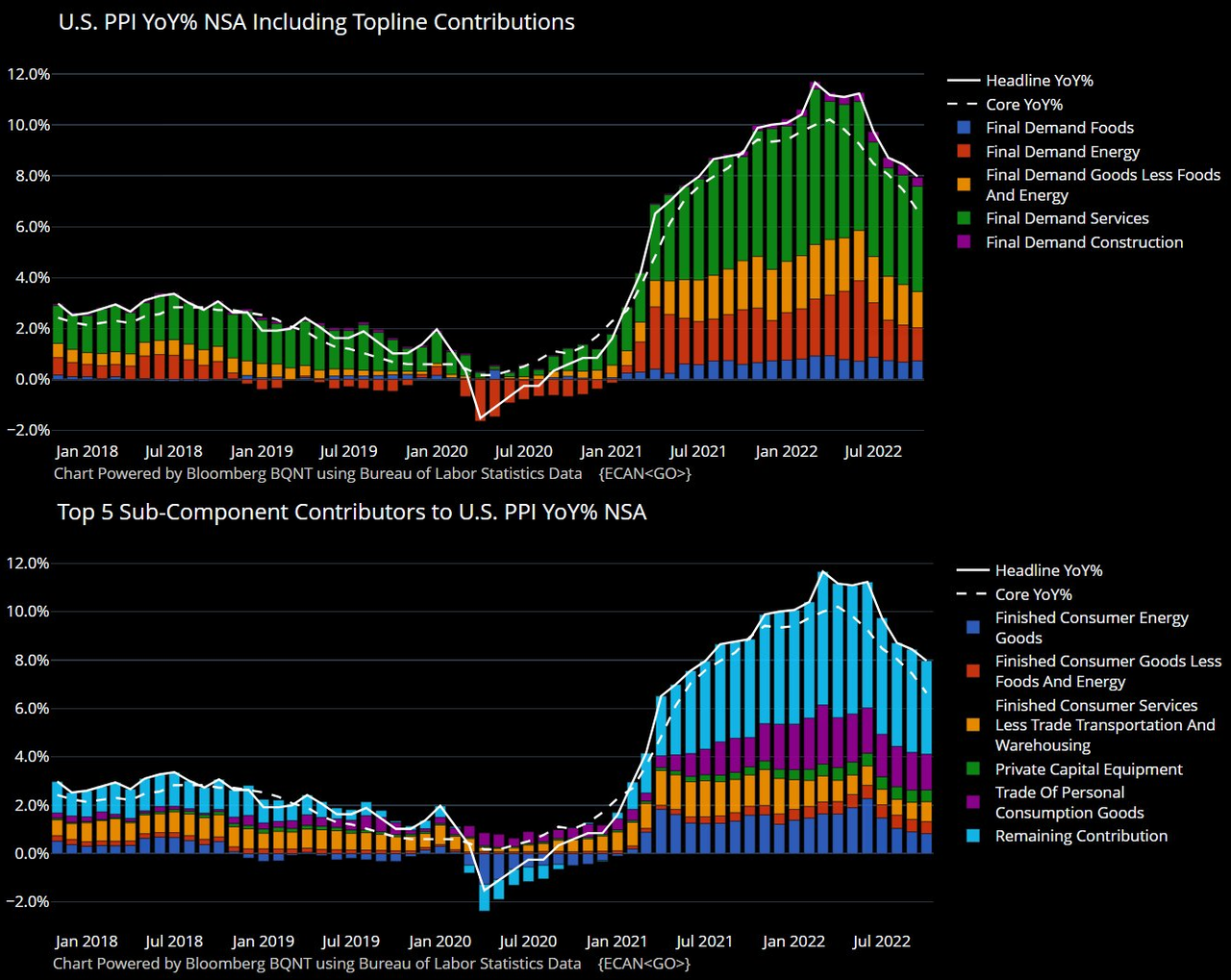 11月に発表された米国の物価指標は物価上昇のピークアウトを印象付けるものとなった。9月の前回記事でも物価上昇はコア化、サービス化しつつであるとしていたが、その流れはいまだに続いている。10月分CPIはエネルギーの減速が明確であり、またコアCPIの中では自動車の減速がようやく目立ってきた。