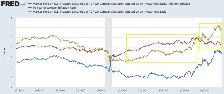 短期のBEIはもっと極端な織込みになっている。直近までのチャートが転がっていないのが残念であるが、1年BEIは3月に6%台を付けたのがピークとなり、9月のリスクオフ局面には2%を割り込んでいた。この値動きは一部は原油価格の反落などを受けたBEIの時間推移であり、一部は同じ1年物でもフィキシングが2023年3月CPIから2023年11月CPIに移動した影響であり、インフレカーブを毎月ロールダウンしている形にもなる。5年BEIとなると来年中の動きも均されるのでもっと安定している。原油価格がピークアウトした途端に、短期のBEIは来年後半にヘッドラインCPIが3%を割れることを確信して疑っていないようである。