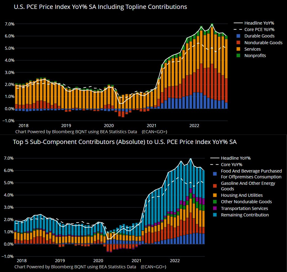 肝心の来年の物価指数がどうなるか。本ブログの長期予想は前回の記事からあまり変わっていない。コアCPI・コアPCEが4%を割って速やかに3%に向かうことには懐疑的であるが、原油が再び最高値更新レベルの爆騰を見せない限り、ヘッドラインCPI・ヘッドラインPCEが来年半ばにはコアを逆転して下に抜けるのはかなりイメージしやすく、その時にはパウエルFedは2%台へのヘッドライン・インフレの低下が一時的(Transitory)であることを説明させられるだろう。コアは恐らく3%台で粘着的なので、消費財のYoYデフレ効果が消える2024年になると再び上向いてコアに近づいて来るイメージを持っているが、果たして。