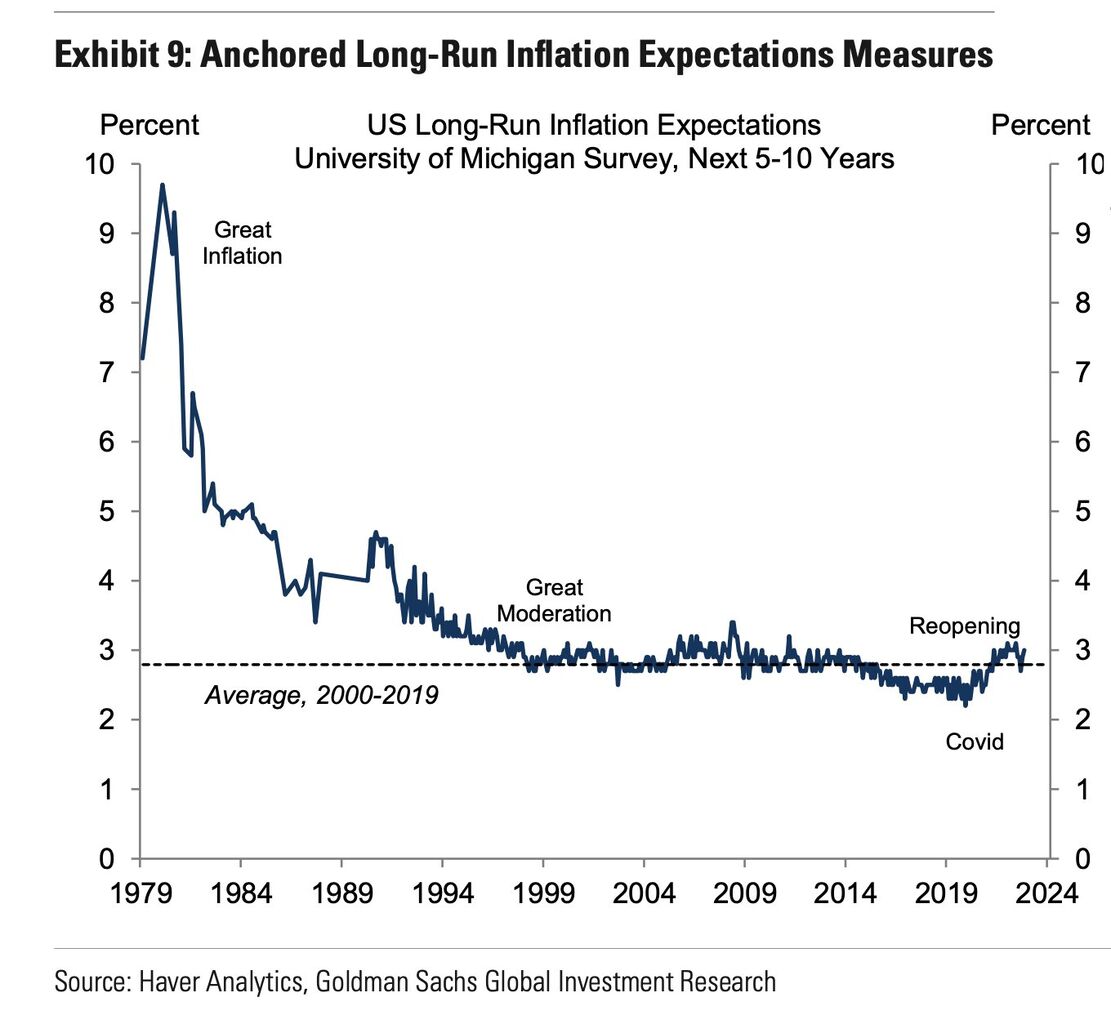 現に物価連動国債(TIPS)の取引価格から算出されるマーケットベースの長期インフレ期待(BEI)はパンデミック後は2%前半で完璧に安定している。2022年春にパウエルFedがインフレをTransitoryでないと認め、遅行指標であるCPIに一喜一憂する退化の道を歩み始めた後は、米国債金利は安定したBEIを横目に実質金利主導で上下に動き続けた。これは米国債市場の参加者が10年スパンのインフレ懸念を全く感じないまま、Fedの政策金利パスの稚拙な右往左往そのものを面白がってトレードしてきたことを意味する。一方でミシガン大学サーベイによると家計の長期インフレ期待も3%近辺で安定している。実際のインフレの高止まりがあまりにも長く続くと長期インフレ期待のアンカリングが外れてしまうのが速やかなインフレ退治が必要な理由であり、それは全くリーズナブルな議論ではあるが、今のところアンカリングは外れる気配がない。マーケットベースも家計もインフレ期待がそんな感じなので、1970年代の再来の懸念があったと一部の人々が声高に叫んでいたと将来の経済学部の授業で言っても、学生にはなかなか信じてもらえないだろう。