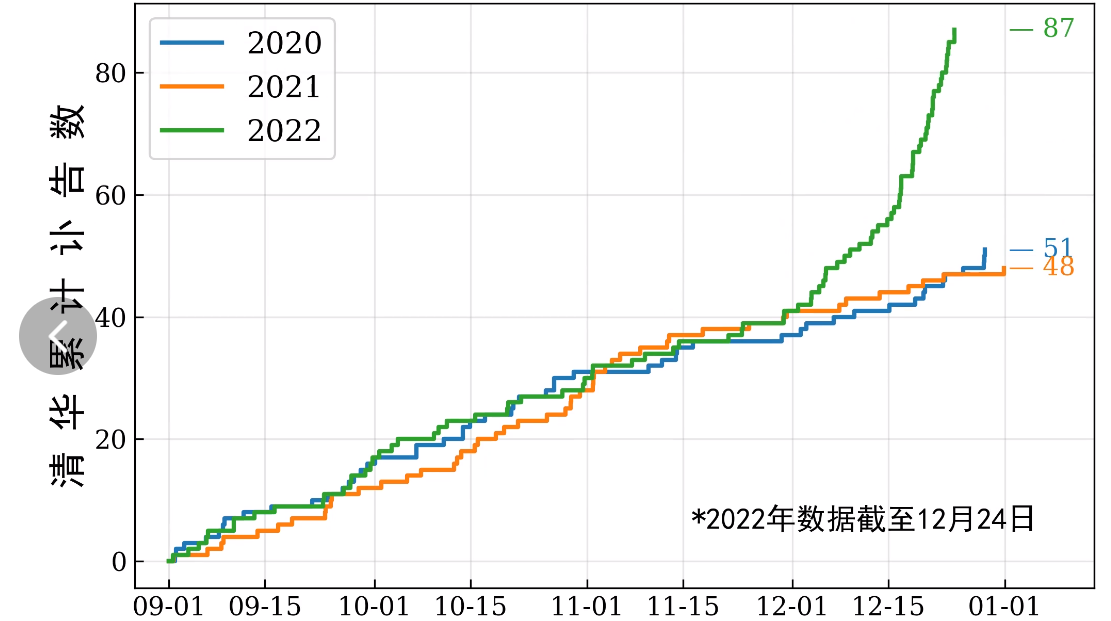 現実の感染者数とコロナ関連の死者数は当然公式より遥かに多いに決まっているが、ゼロコロナ政策の終了後に透明性が一気に落ちたので正しい全体図を入手する手段はなくなった。国家衛生健康委員会の会議記録とされる流出文書では「12/20の1日だけで3700万人、これまで2億4800万人が感染した」としていたそうである。WHOでさえ中国が急に足を引っ張り始めたせいでパンデミック緊急事態の終了を宣言するのは時期尚早と考え始めた。恐らくまずは都市住民の間で流行っているので海外に出た人達の中では更に密度が高く、イタリアでは到着した航空機の旅客を検査したところ半数が陽性という結果も出ている。症状もデータは当然ないものの体感ではmRNAワクチン社会より重いようで、オミクロンでも一週間の高熱が出るケースが多いように見える。表に出ている情報の中でも分かっているのは有名人の訃報が続いてることであり、例えば清華大学が発表している教授やOBの訃報をカウントすると(冒頭のチャート)12月に入ってから急に例年のペースから大きく上方に逸脱している。