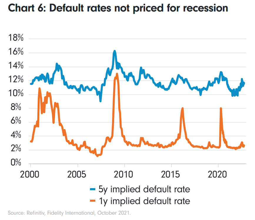 従って債券投資のウィンドウは近付きつつある。短期のモメンタムは悪いものの、特に長期目線の投資家にとってはそうである。インフレはピークアウトするので、ブラックロックとは真逆に債券のヘッジ機能も復活する。クレジットについてもブラックロックとは逆に、ハイイールド債などはアナリストが見積もる来年以降のデフォルト率の上昇を織り込んでおらず、やや割高と見る。