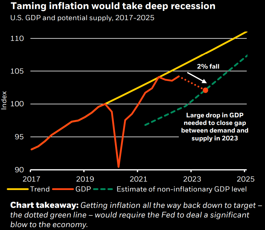ブラックロックの大局観から始めよう。過去40年間の大安定期(Great Moderation)が終わり、今後の新レジームでは先進国は①高齢化に伴う人手不足②地政学的な緊張③ネットゼロによるエネルギー供給のミスマッチが生産能力を制約するため慢性的にインフレ・レジームとなる。中央銀行は供給能力の改善には無力であるため、需要をクラッシュさせ続けるか、インフレとの共生を選ぶしかないが、明らかに前者が選ばれているためリセッションが予想される。明快である。新レジームでは旧レジームのような漫然とした押し目買いはワークせず、常に点検を必要とする。