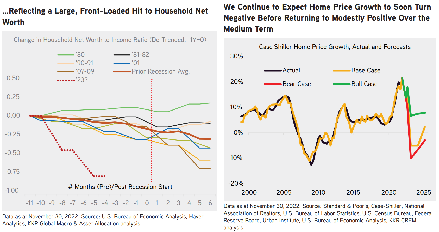 住宅価格は中央銀行が最も直接的に成長を減速させるパスの一つであり、2023年と2024年に5%ずつ下落を見込む。それによって家計のネット資産は以前のどのサイクルよりも早いペースで収縮している。