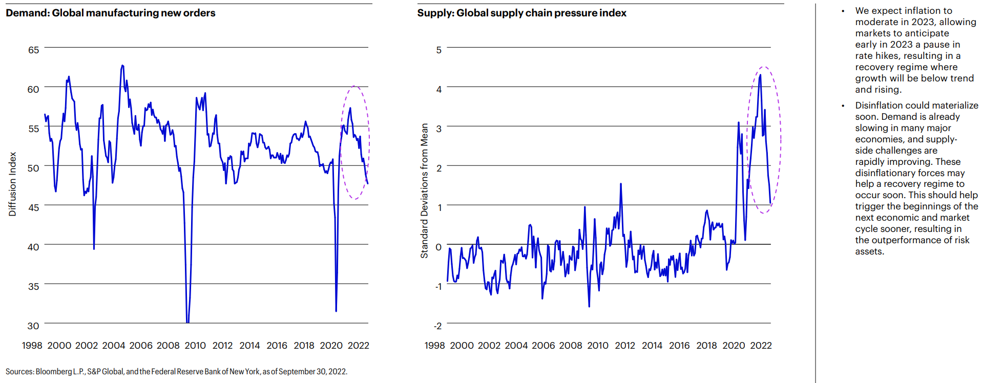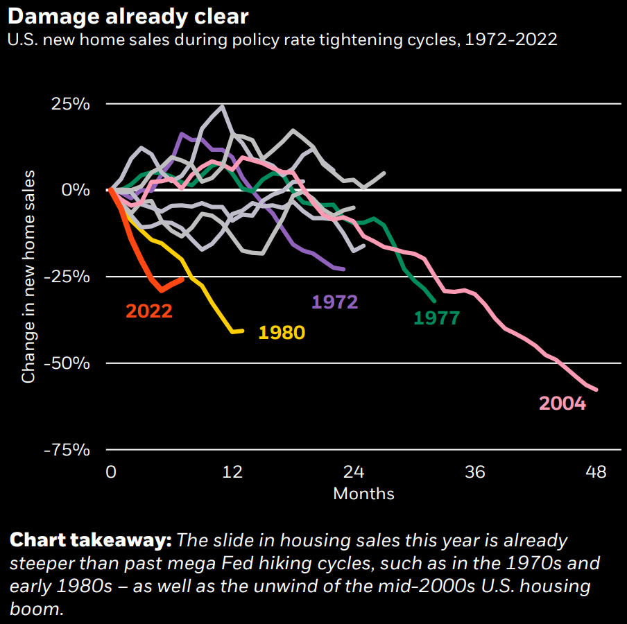同じくPE大手のアポロ。Fedの利上げは既に3つのチャネルを通して実態経済に影響を及ぼし始めている。①金利センシティブな住宅、自動車、設備投資の減速②時価総額が減ったテックのリストラ③ハイイールド債発行の萎縮、である。これらの経済へのインパクトは通常12~18ヶ月後に最大になる。従って資産価格の正常化にはもう少し時間がかかるものの、2023年後半のFed Pivotは資産価格にとってポジティブになる。