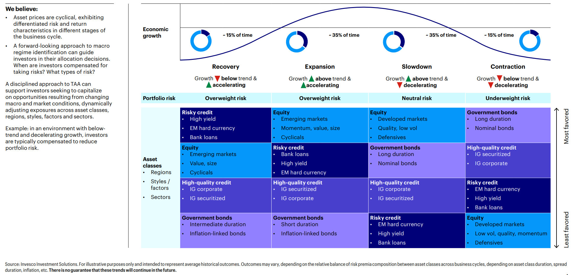インベスコはサイクルが「減速」を経て「収縮」に入ったとしている。インフレは需給両方から緩むとしているがスコープがやや財に傾いている。次は「回復」フェーズになるがサブ・シナリオとしてインフレが高止まりした場合は「収縮」が続くとする。債券を選好し、また株式よりクレジットリスクを選好する。