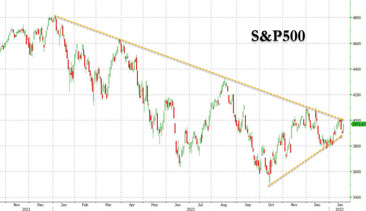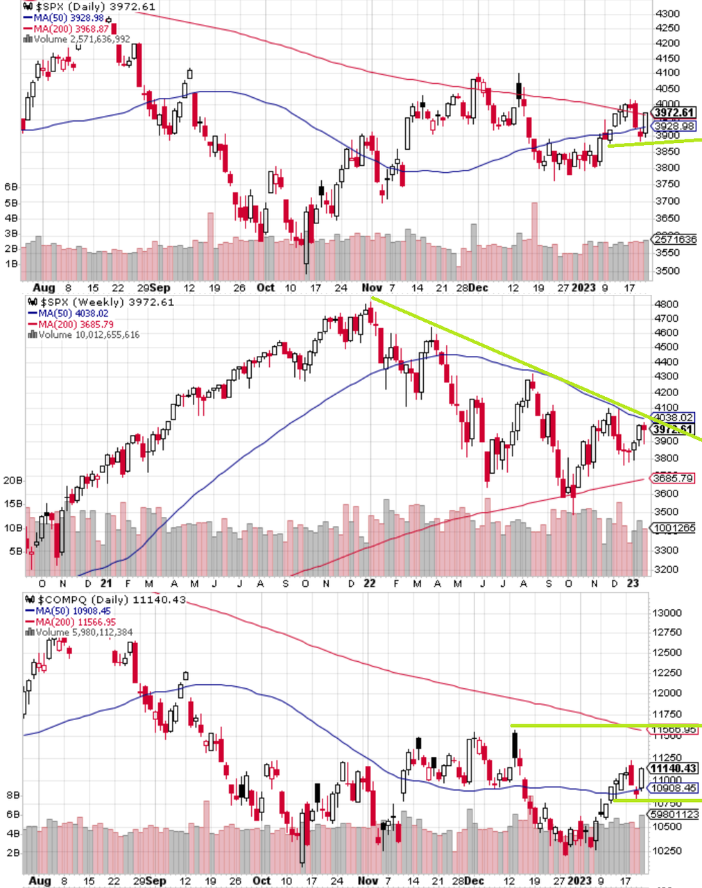 先週のS&P 500は行って来いとなった。「金曜は金利上昇を無視してS&P 500だけが上がっているので週前半は調整しやすそうに見えるし、過去もOp ex直前の週が最もリターンが悪かったので多少の押しがあっても、3800~3875が守られる限り驚くべきではない」としていたが、週半ばの下押しはまさに3875手前の3885で跳ね返った。週足下ヒゲの3875ではなくキリがよい3900をサポートに考えていた市場参加者は困惑しただろう。上値では「4050 -4100がレジスタンス」としていたがこちらには届かず4015で日足上ヒゲ陰線を作って反落している。上昇していた米金利自体は、水曜の日銀のYCC継続を受けて大幅に低下し、更に米国の小売売上高が滑ったのを受けて大幅低下に転じた。それでゴルディロックス相場になるかと思いきやそういうわけでもなく、週央は株安金利低下、金曜はOp exを通過したこともあって一転して株高金利上昇となっている。物価上昇減速のパスはいよいよ確定的になったので中銀関係者発言ももはや材料視されず、テーマが物価から成長懸念に転ずるのにつれて株と債券は逆相関に戻りはじめたように見える。同時に、戻り売りから押し目買いの地合いに変わったとの声も見られたが果たして。