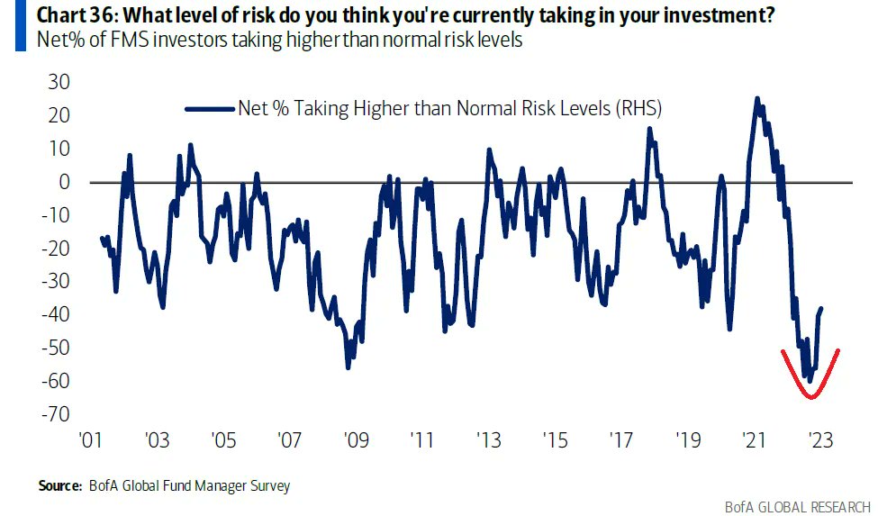 BofAのFMSでは米株のオーバーウェイトが21世紀の中で珍しい水準まで落ち込んでいる。一方、リスク水準は極端な圧縮から戻し始めている。