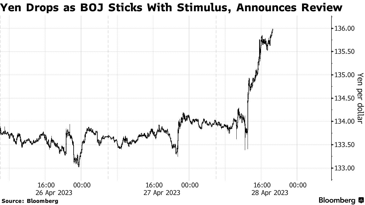 さて植田体制になった4月会合。繰り返すようだが、植田体制は黒田体制ほど方針転換ありきで鳴り物入りでノミネートされたわけでないので、最初の会合で劇的な方向転換を打ち出すはずがなかった。とはいえ本ブログでさえも黒田日銀時代のようにせこい嫌がらせでバックファイヤーする可能性はさすがに少なくなるだろうと考えていたのだが、植田日銀の黒田日銀からの連続性は本ブログの想像をさえ超えた。国債金利が大きく反応したのが3月会合だったのに対し、4月会合で改めて金融緩和縮小の遠さを実感したのは為替市場であり、4月会合を起点に円安が進んだ。