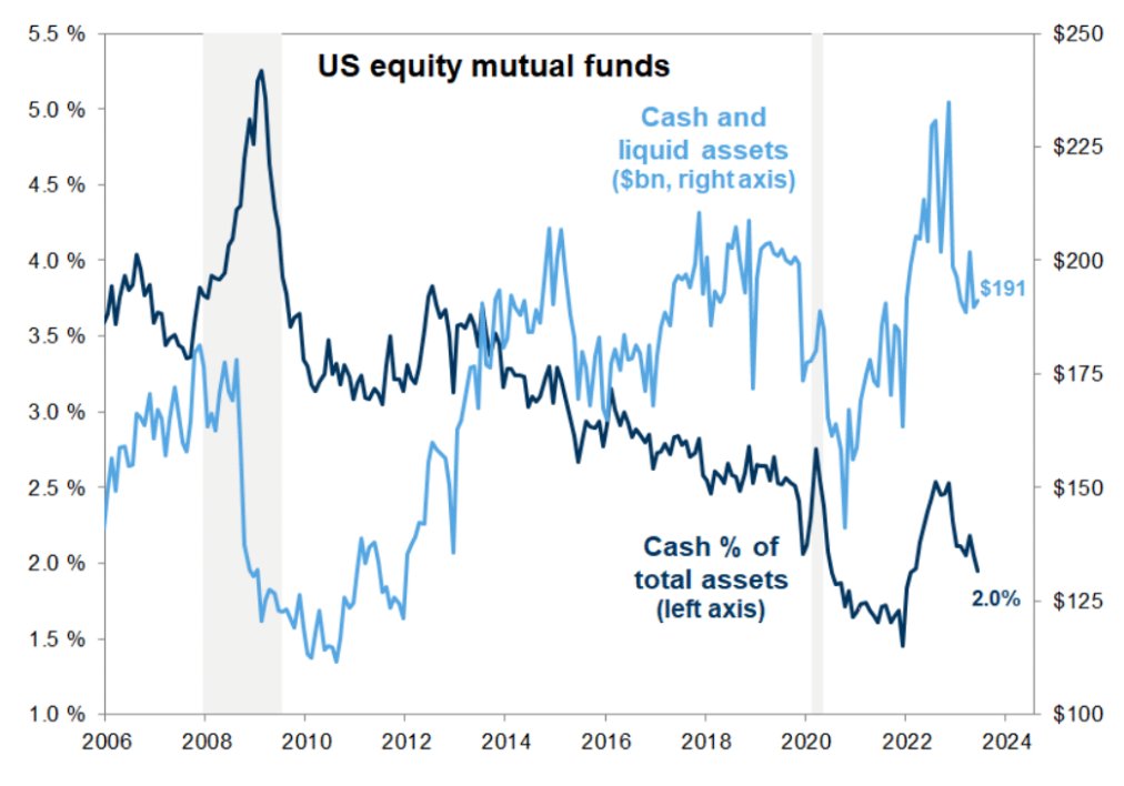 繰り返して取り上げてきたように投資信託は現金を減らして株式を復元している。経済データが好調なのを受けて「リセッションが来るのでポジションは軽くディフェンシブに」と言ってられなくなったのである。