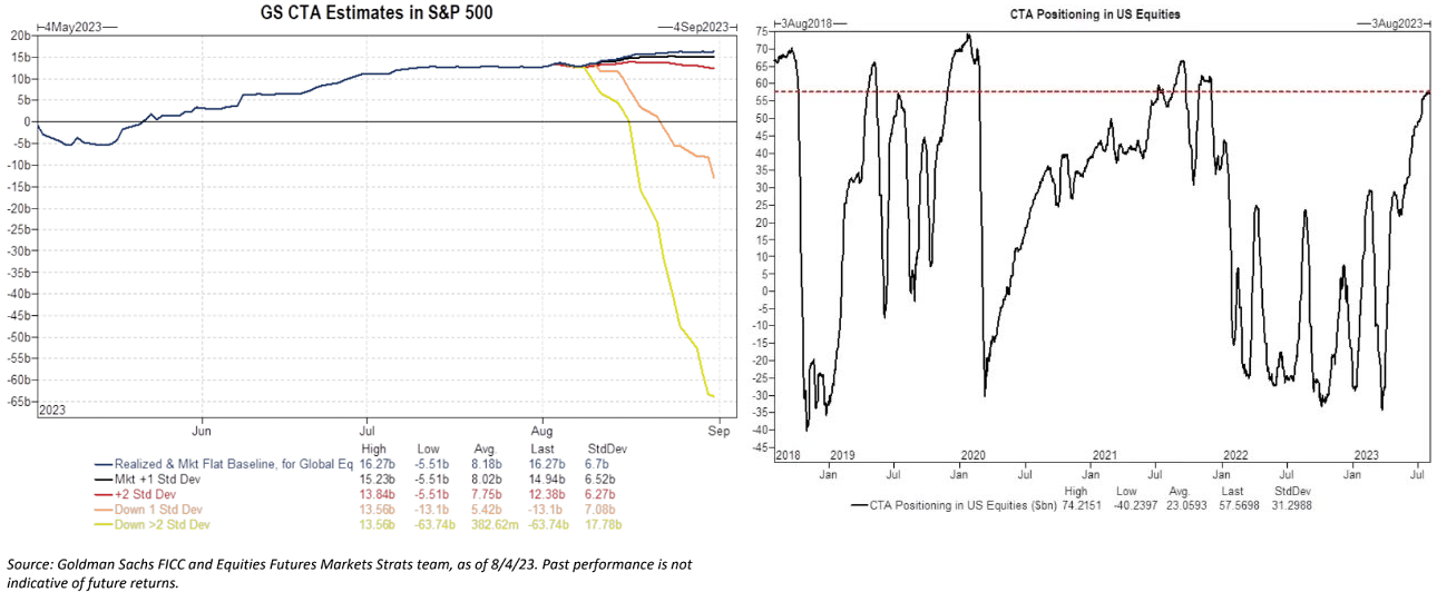 GS CTAはもとより8月初旬から売りに回る公算が大きいとされていたが、6月以来このCTA売りは何度も延期されてきたので頼りにしづらかった。しかし一旦トレンドそのものまで下向きになると満タンになっていたCTAの売りから逃がれられる可能性は低下する。1日2%ほどの下げはなかったのでVolコントロールの方は炙り出されたと判断する理由がない。