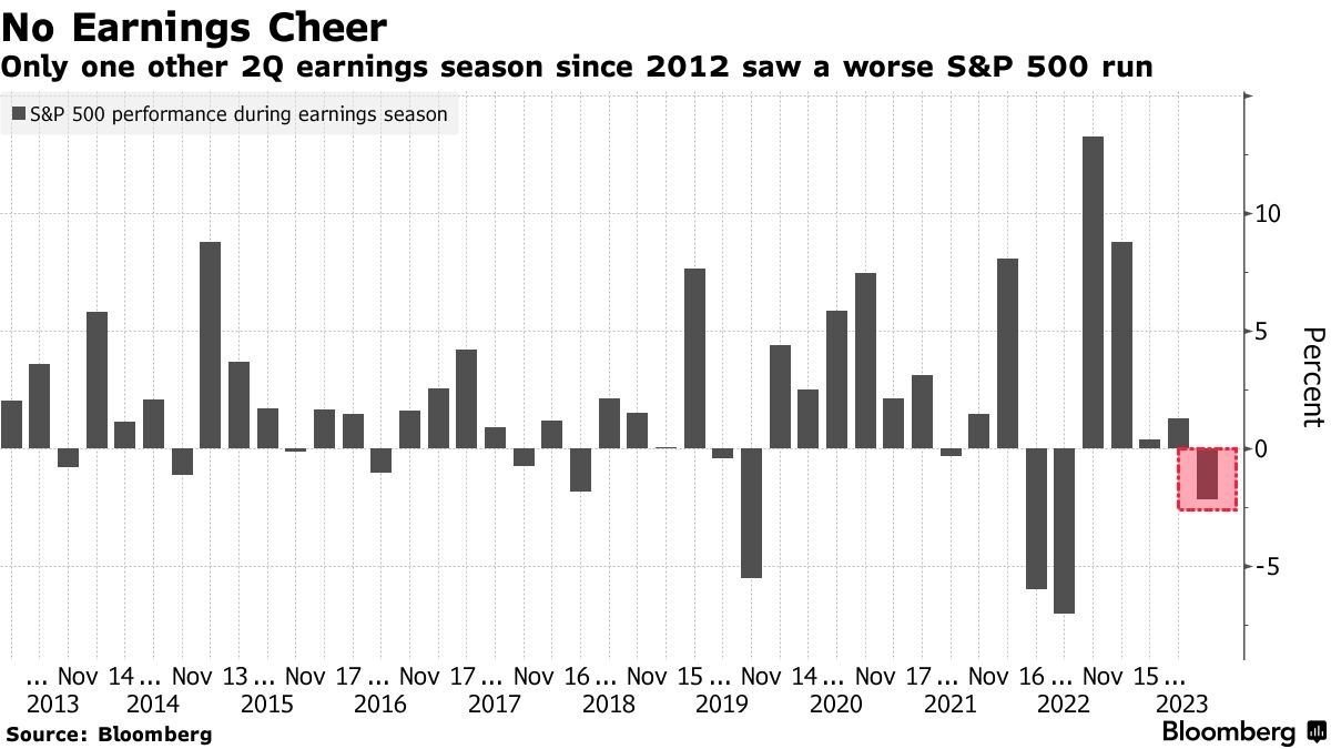 決算前にあまりにも指数が脳死で上昇していたので、決算でビートしても上がらない現象はフォローしてきた通りである。最初はそれでも押した後の押し目買いが優勢だったが、結局あまりにも強い同じ傾向が積み重なったため、今回の決算シーズンの指数パフォーマンスは過去対比でも悪いものになっている。景気が強いだのディスインフレーションだのというマクロだけからの雑なブルストーリーでは高値圏で決算期を越せなかったのである。