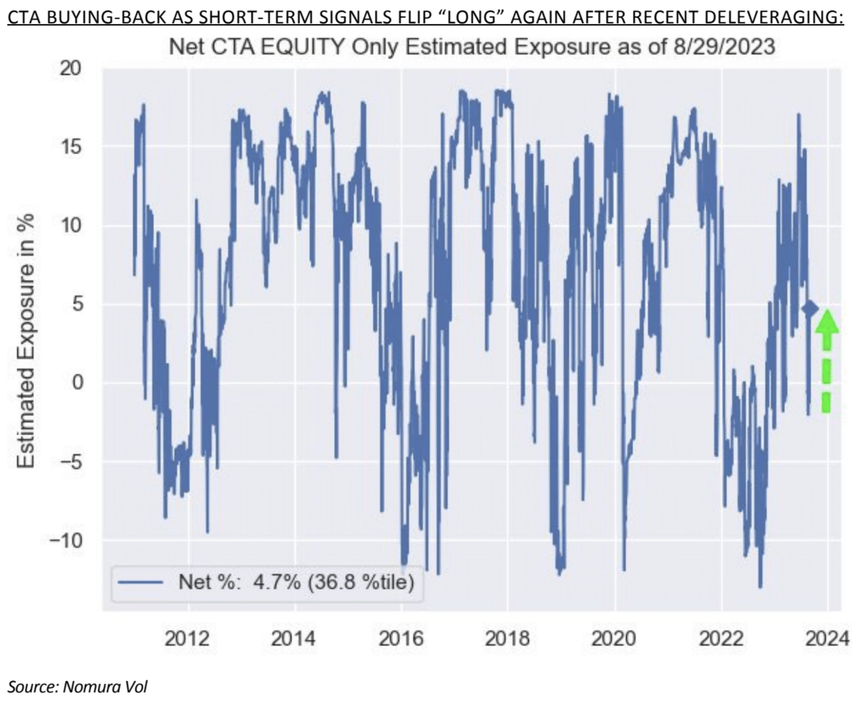 一方、野村はVolコントロールが下落局面でそれなりの勢いで売却に動いたとしている。1日の値幅が2%を超えるとVolコントロールの売りが目立って来ると野村も指摘する。更にCTAについてはトレンドが下落から上昇に転じたのを受けて買い戻しが目立ってきた。前回の記事で「CTAは順張りなのでチャートそのものが先に上向きになれば売りも止むだろう」と見ていた通りである。