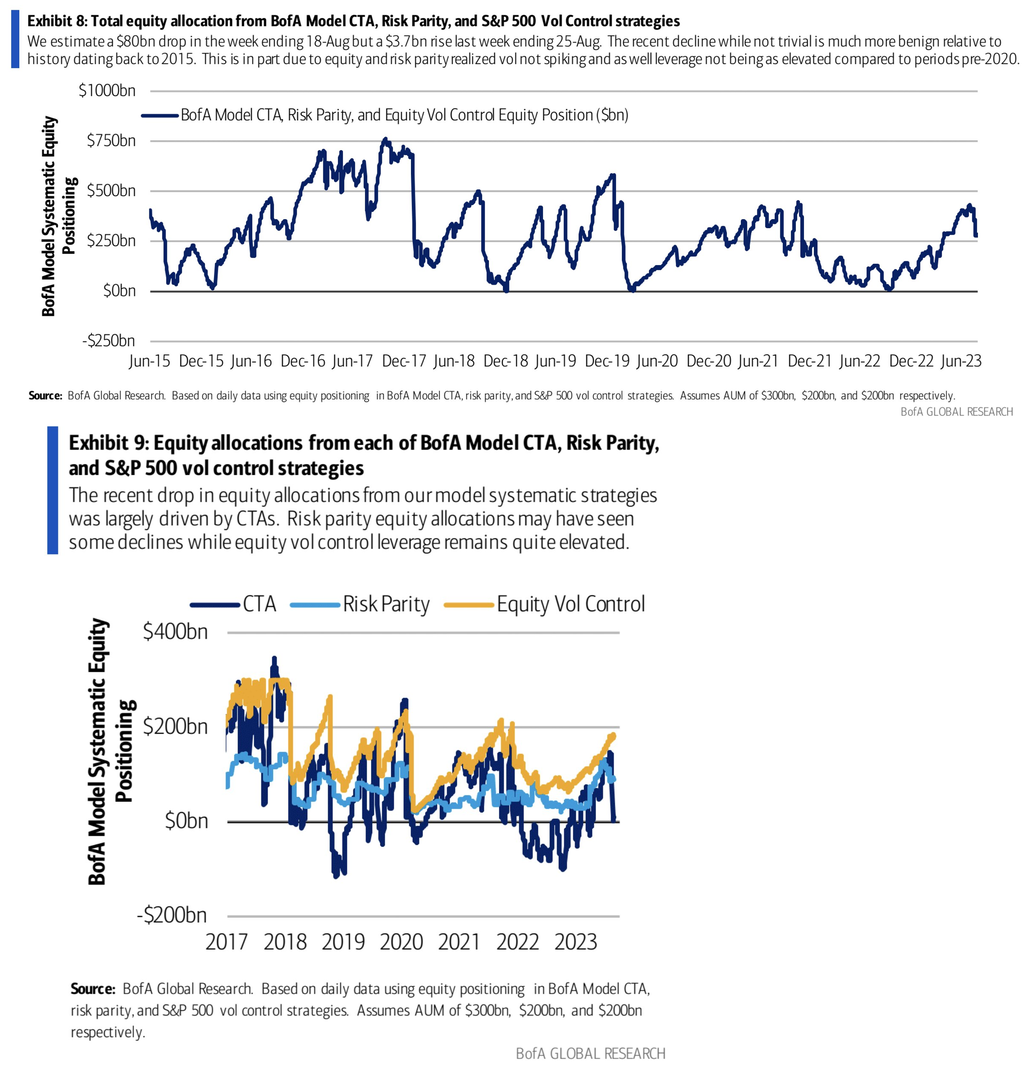 BofAのシステマティック勢ポジションはCTAが下落局面で大幅に売却、リスクパリティは少しだけ売却、Volコントロールは変わらずとなっているが、一般的にはVolコントロールの方がリスクパリティよりも俊敏に動くはずではないか。