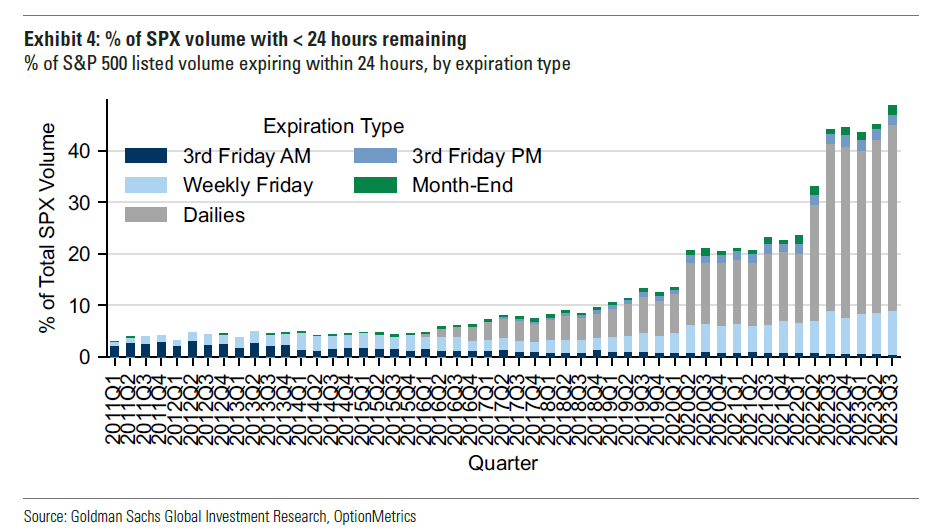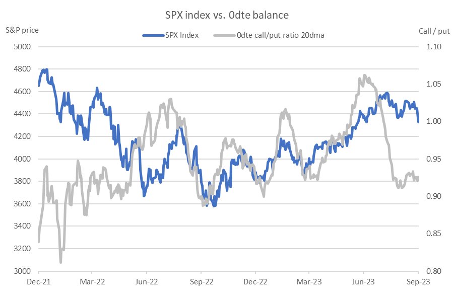 0DTEについて述べた前回の記事では、0DTEのアクティビティは「安寄りした日の前日比フラットまでのコール押し目買い」が目立っており、それは低Volレジームの自己実現に寄与するのではないかと述べてきた。「ボルマゲドン "Volmageddon"」を警戒する必要性は軽視を宣言した。前回の記事が書かれた4月から8月にかけて、S&P 500はファンダメンタルズの懸念要素の多さに反して7月まで低Volレジームと、それが可能にした壮大な上昇相場が続いた。逆に8月にファンダメンタルズの懸念要素が減って「好景気ではないか」という脳死ブルが湧き始めると、肝心の指数はどんなに褒めてもせいぜい水平レンジとなったが、それは今回の記事の本題ではない。その後0DTEはどうなったのかというと、2023年Q3になってから0DTEのオプションに占めるシェアは更に上昇しており過去最高を更新している。