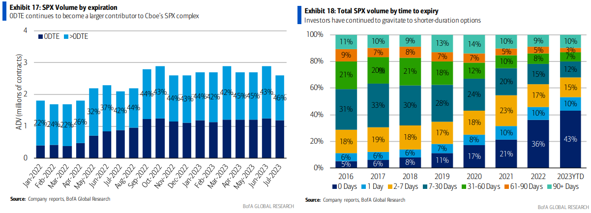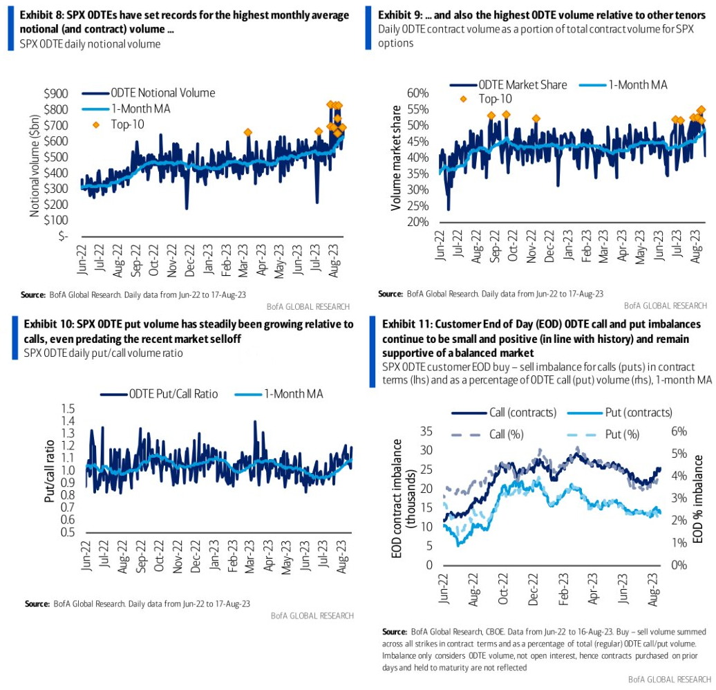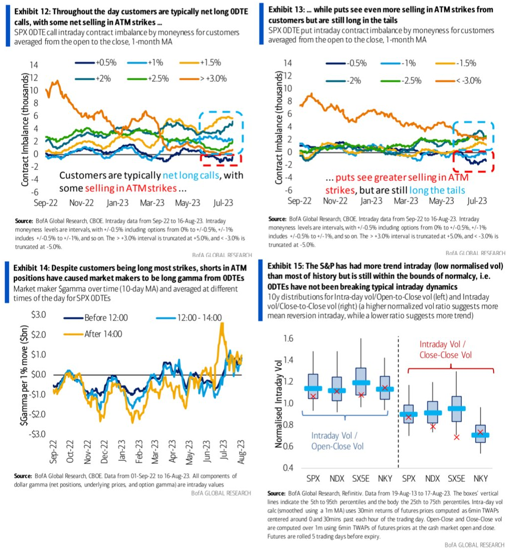 では更に増えたのが不安要素、具体的には主にディーラーに下方向に追加ヘッジを強いる「ボルマゲドン "Volmageddon"」が起きるリスクを劇的に増加させたかというと、今のところどの時間帯で見てもマーケット・メイカーを著しいガンマショートにさせていない。またヒストリカル対比でも、0DTEが流行っていない他の株式指数対比でも、顕著にイントラデーのトレンドが加速しやすいとまでは言えない。従ってBofAは0DTEのボリュームとシェアが最高値を更新してもそれは質的変化ではないとしている。だとすれば本ブログが4月に述べたように低Volレジームを自己実現させる構図は変わっていないということか。