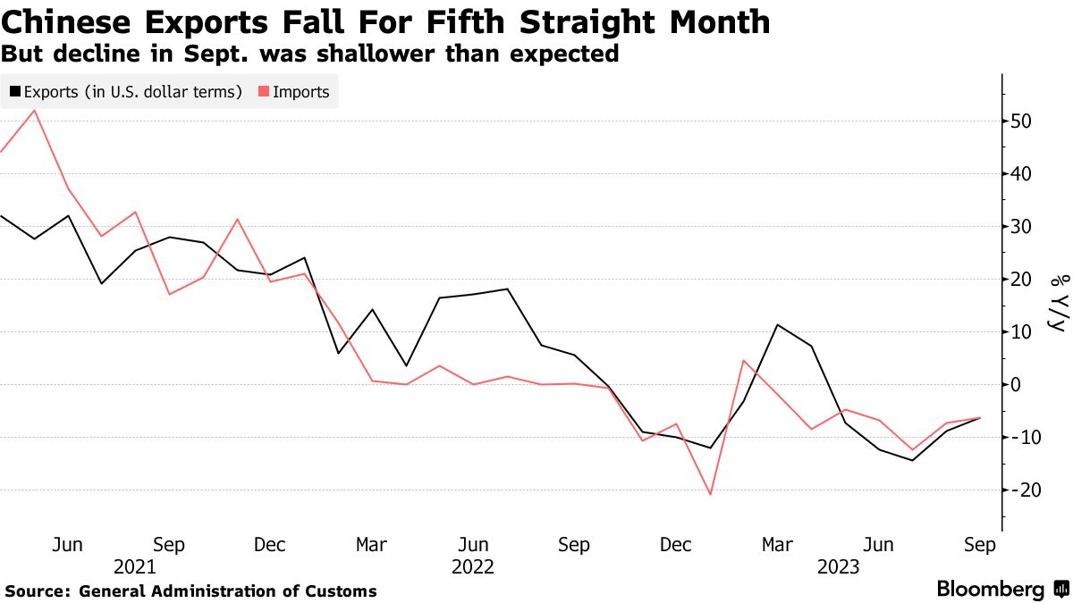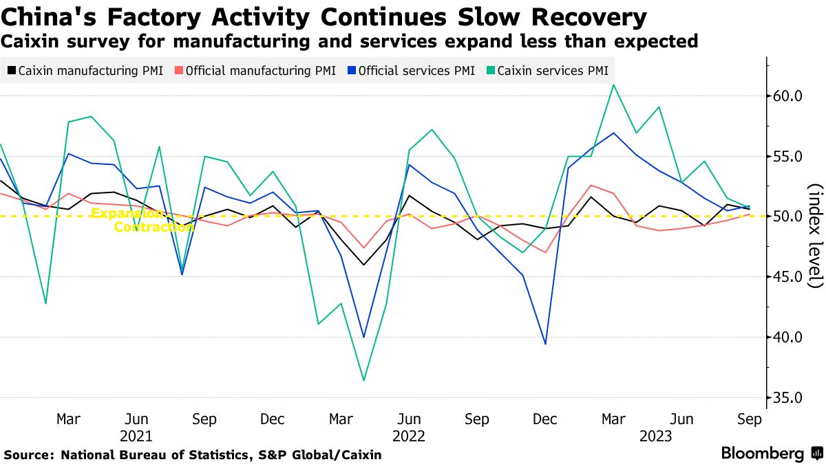 前回の記事では中国の8月の限界的な景気回復が内需ではなく外需回復主導のものであったとの仮説を立てたが、9月のデータはその見方に沿ったものになっている。中国のPMIは国家統計局(NBS)版、財新(Caixin)版の二つがあり、それぞれ製造業とサービス業で合わせて4つあるが、9月分はNBS製造業PMIが緩やかに回復、財新製造業PMIが横ばい、NBSサービス業PMIが少し反発、財新サービス業PMIが続落となっている。製造業が極めて緩やかながらも上向き(景況感下げ止まり)になっており、中でも輸出に携わる大企業が多いNBSの方がその傾向が強く、一方でサービス業はリオープン効果を食いつぶす形で明瞭な減速が続いている。サービス業主導の回復は存在せず、外需しか戻っていないことがPMIからも分かる。