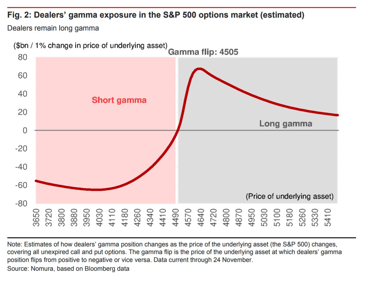 テクニカル。週足は短い下ヒゲ陽線となり、安値4537はサポートとなる。その下でも4500台は小動きと想定される。これまた1週間以上前のチャートだが野村によると4500台ではディーラーがロングガンマであり、4500を切って初めて下落が加速する可能性が出て来る。年末のJPMカラーのエクスパイアまで小動きが続くか。