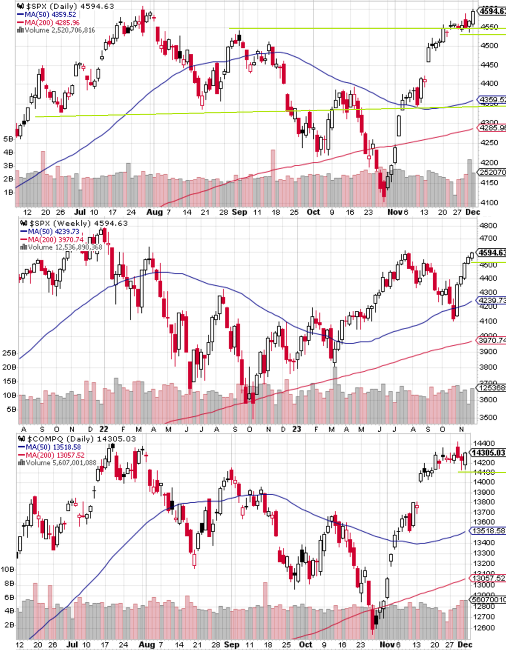 S&P 500は静かに続伸している。サンクスギビングが明けても大きな動きは見られなかった。中身はGAFAMが弱く、それまで売られていた小型株中心のラリーとなった。ダウも大幅に上値を伸ばした。ISMなど経済指標は弱く、金利低下幅ほどには指数が上がらなかった気もするものの、株式指数が逆行安になるほど景気懸念が高まったわけではない。水曜は一度指数が上値を伸ばしたものの、ほぼ寄り天となり押し戻され、金曜になってようやく再び4600にチャレンジしようとしている。前回の記事では小動きを想定していたが、S&P 500は上昇が優勢となり、ナスダックに限っては上を買って下を叩かないことが大事だった。