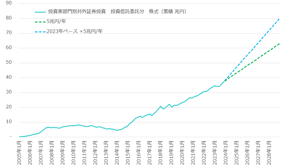 もちろん年5兆円にはこれまでの一般口座や旧NISA口座で保有する投資分からの置換も多く含まれるに違いない。これまでの投資信託の運用会社を通した海外株式投資額の推移は財務省の「対外・対内証券投資」から読み取れる。これは2015年から増え方が急になっているが、今後の推移に対して緑の点線が「年5兆円ペース」であり、青の点線が「2023年ペース +年5兆円ペース」である。年5兆円が完全に新規資金とは限らず、一方でボトムにはなるので、今後の海外投資ペースは二本の点線に挟まれた推移になると思われ、2015年~2023年のペースよりは上方に屈折する可能性が高い。