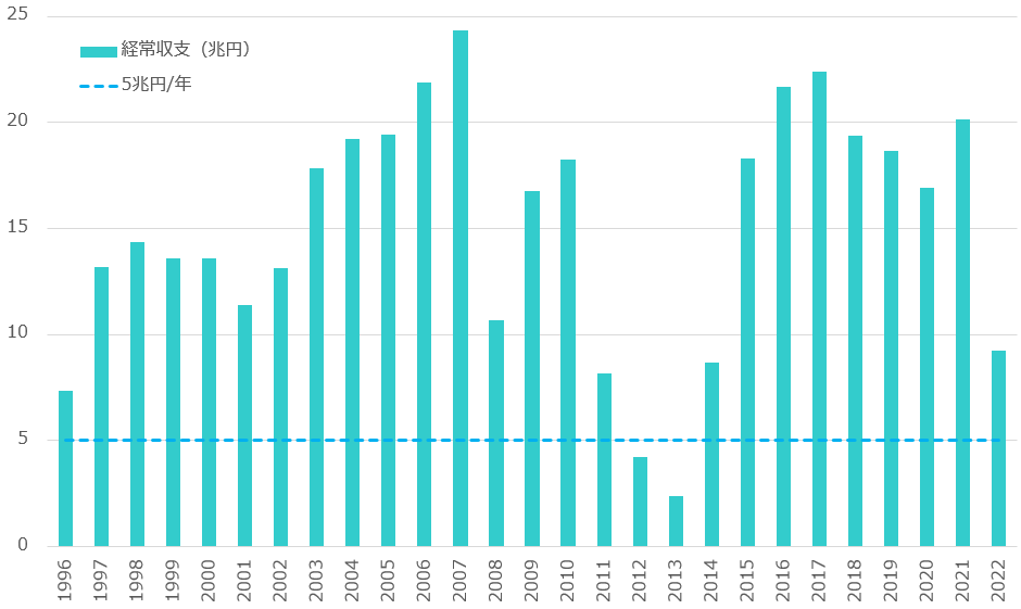 今のNISA口座数は2千万程度と考えられ、月間2,300億円の積立て予約は平均して一口座あたり1万円強となる。これは、そうは言っても一人当たり月間10万円も余剰資金を捻出できない家計、そして積立てで長期投資を行うインセンティブがない家計が多いからであり、2千万口座が全て月間10万円の積立て枠を使い切ると考えるのは現実的ではない。実際使い切ったら毎月2兆円、毎年24兆円のフローという計算になり、それが新NISAの積立て部分が動員できる新規投資額の天井となるが、さすがにその桁には近づかないだろう。いずれにしろ、年間5兆円の海外投資フローを想定するのはかなりフェアではないか。