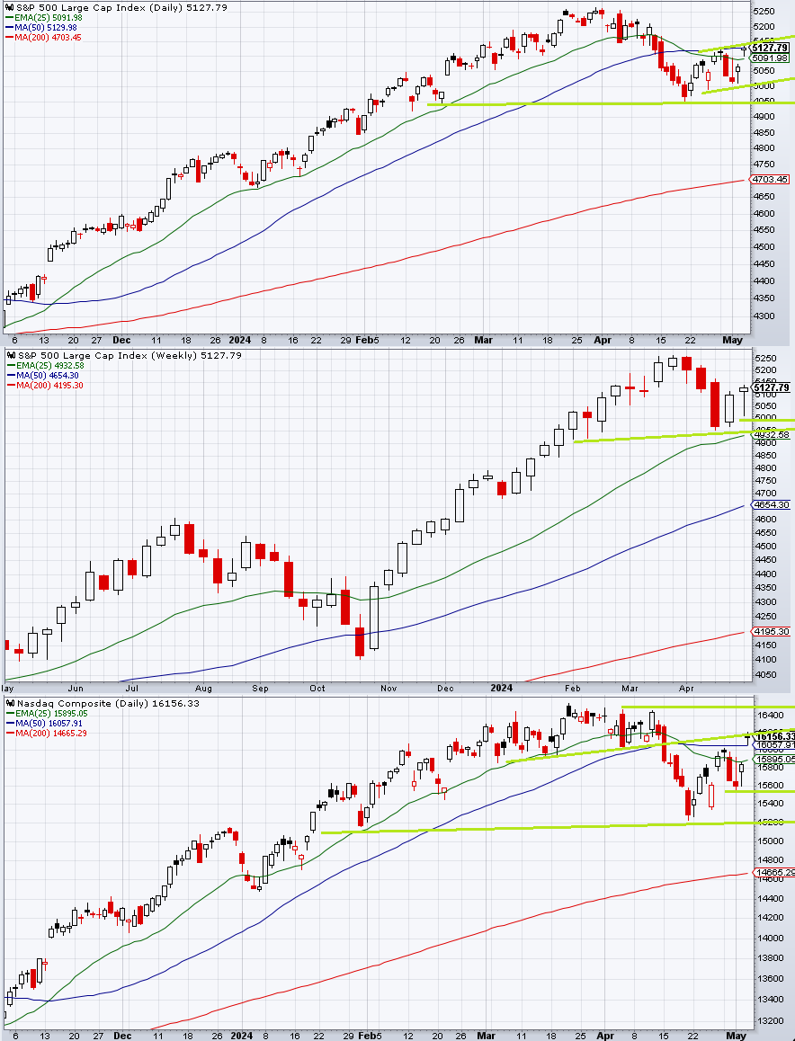 GW週に日銀の為替介入に押されてすっかり影が薄くなったS&P 500。週初めの30日にFOMCの前座と言わんばかりにECI(雇用コスト)を受けて金利が急上昇し、株式指数を押し下げた。特に引け間際に大きな売りが入っており、ないと思われていた月末リバランスの株売りがサプライズになったように見える。ECIはバックミラーなので本来重要な指標ではなく、この調整は1日のFOMCに向けたものという印象が強かった。引け後の決算はAMZNが堅調でAMDが滑っている。FOMCに向けては調整が付いた形になるため、実際パウエル議長の記者会見が終わるまでタカ転換がなかったこともあり指数は一時ゴルディロックス気味に大きく跳ねた。しかし記者会見が終わった途端に、機械か、裁量なら前もってFOMCがどうなろうとそのタイミングで執行すると決定されていたであろう売りが降りかかってしまい、FOMCデーの日足は長い上ヒゲ陰線になってしまった。もっとも引け後に控えていたクアルコムが堅調で、たとえFOMCデーに捕まっても翌日助かるのが確定した。2日は単位労働コストが悪かったのもあってNY日中は一度アンチ・ゴルディロックスの売りに押されたが上ヒゲ陰線を下ヒゲ陽線で返すことができた。最後のイベントである、広く減速すると思われていたAAPLの決算について先週の記事で「直近の急落をほとんど全戻しした状態でAAPLを迎えるならオッズが悪くなりそうだが、調整後に迎えるならサプライズの少なさがサポートになるだろう」とした通り、それまでに調整を済ませてあったおかげもあり大幅高で通過することになった。
