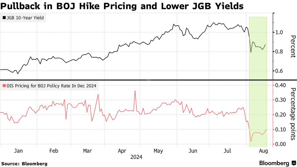 というわけで、7/31の朝に起きる頃には概ね追加利上げが決まったようなものだった。リークの読み方はともかく、さすがにこの期に及んでリークそのものを信じない市場参加者は失格である。答え合わせイベントになったプレスリリースは0.25%への利上げと国債買入れの減額が発表された。リーク記事からも分かる通り審議委員達の意見は7対2で割れた。前回の記事で「植田日銀らしくない」と疑っていた初めての「引締めと引締めのパッケージ」となったが、7月から10月の間に利上げ1回くらいあるのはさすがにコンセンサスだったと思われ、その3ヶ月は大した違いがないため利上げ自体は青天の霹靂ではない。