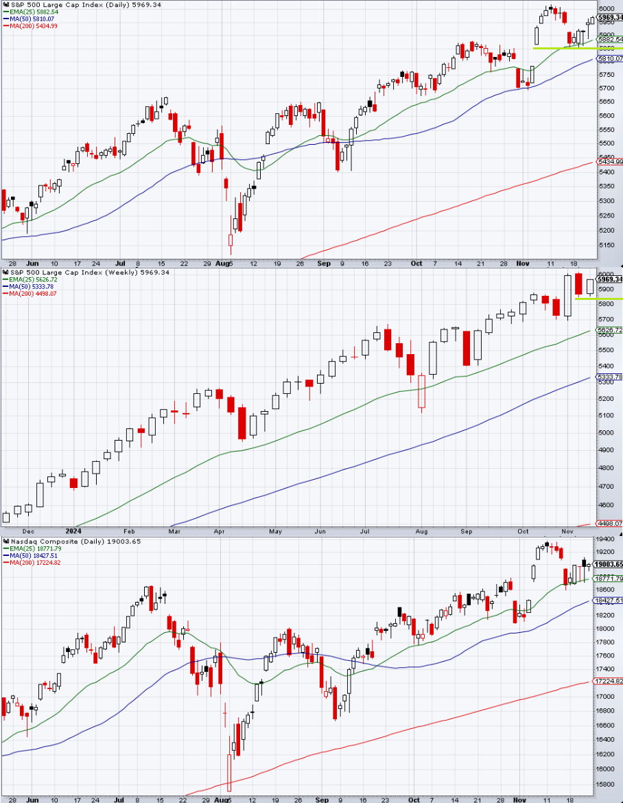 テクニカル。週足は再び下ヒゲ陽線となった。日足は弱々しい3本の下ヒゲ陽線を経て金曜には上値を伸ばし、小さなアイランド・リバーサルの領域に再び突入した。大統領線とも言うべき5860より上での推移が続いた。引続き5860はサポートであり分水嶺となる。今週は感謝祭前で閑散に売りなしになりやすいだろう。上値は年末まで引続き6055より上は重いか。