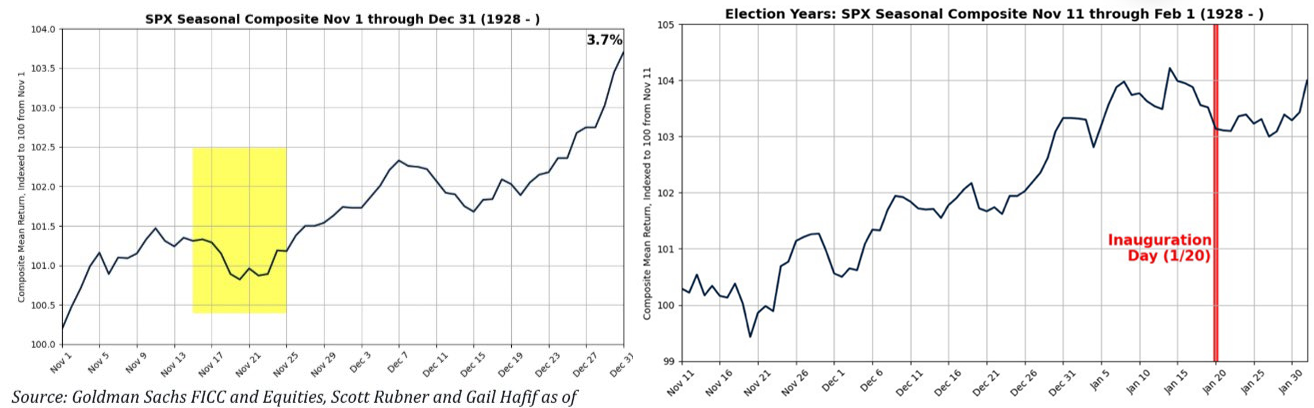 今年これまでのS&P 500のパフォーマンスは好調である。過去の11月までに20%以上上昇した年の12月のパフォーマンスは平均で+1%と大したことない。もっともシーズナリティは大統領選を通過して年末まではラリーが基本で、就任式前から停滞し始める。