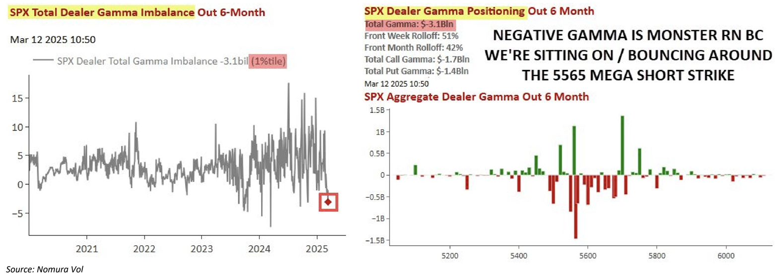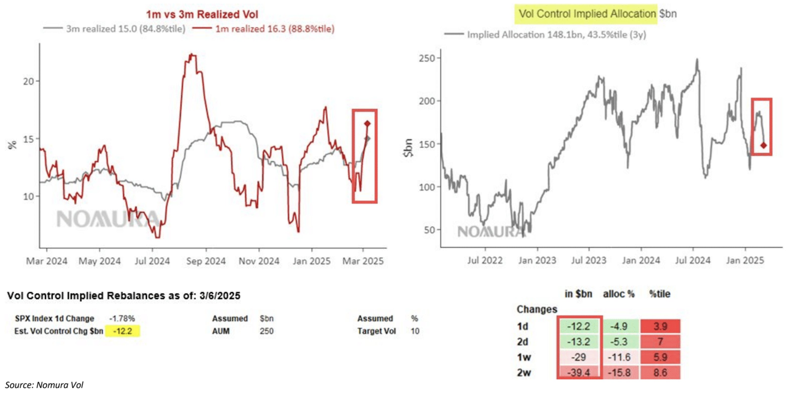 野村によると、ディーラーガンマもスポットの急速な下落に伴いネガティブ域に到達した。JPMのJHEQXのプット買い(ディーラーのプット売り)は5565に刺さっており、それを叩き割ったことで売りが加速しやすくなる構図が月末まで続くと思われる。更にこのポジションがオープンリーチであったことから5565ブレイクは他の市場参加者の警戒も呼んだ。また下落局面でリアライズドVolが上昇したことでVolコントロールのポジション削減も呼んだ。