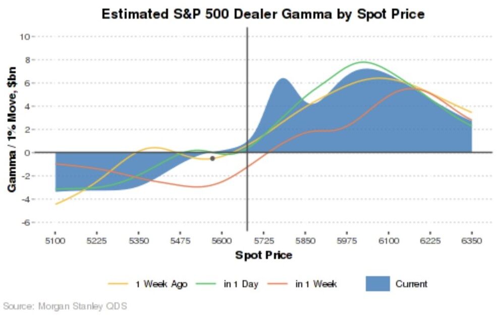 GSのディーラーガンマ一時的にネガティブ域に入っていたのがフラットまで戻っている。個人的な予想ではもっとがっつりネガティブ域にどっぷり浸かっていたのだがOp Exで消えてフラットに戻るイメージだったのだが、GSのチャートはもっとあっさりしている。MSもスポットが5600を上回っている限りポジティブガンマ域にとどまるとしている。いずれにしろ、Op Ex後にフラットになった後にマーケットメイカーは下がった後に追加ヘッジを入れなくても済むようになる。ただJPMの5565はOp Exとは別に月末まで刺さっているため、引続き5565割れは追加ヘッジをトリガーしやすそうである。