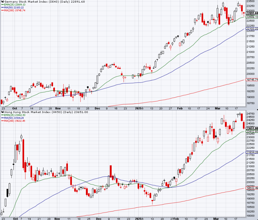 FOMCをタカ転拒否・QT停止で乗り切ったのに株式の続伸がしょぼかったのは、それだけポスト関税の景気懸念が強く、大掛かりな金融緩和でないと足りないためと解釈される。関税発動に伴う駆け込みの息切れ、雇用指標でのDOGE効果の確認、どちらが確認されても景気減速懸念とビハインド・ザ・カーブ懸念がセットで持ち上がりやすく、現に4/4の雇用統計のインプライドVolが最も高い。3月最終週に限っては主に月曜のPMI速報値が要チェックと思われるが、実際に最も大きな値動きが警戒されているのは金曜である。月末リバランスで今月の動きのリバーサルが入りやすいとも思われる中、素直に見ると今週も何もなければ週末が近付くにつれて堅調に転じやすいように見えるが、このスケジュールとは別に4/2以降の関税についてのヘッドラインには引続き要注意である。4/2以降の関税について織込み不足では徐々になくなっている気もしているのだが、どうせ4/2以降に少なくとも一部の不確実性が持ち越されるとすれば、それまでにヘッジを外す理由がない、と考える市場参加者の方が多そうである。逆に言うと、関税のヘッドラインが実際に飛んだ時の下げはレバレッジ勢にとっては辛いものであるが、そういう人達の押し目買いやショートカバーの機会と捉えられるようになるだろう。