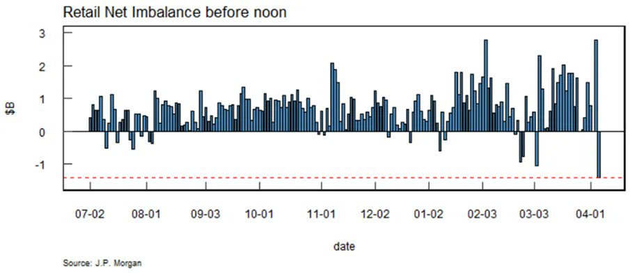 JPMによると、個人投資家は木曜4/3に大きく買い越してから、金曜4/4の続落局面でぶん投げている。