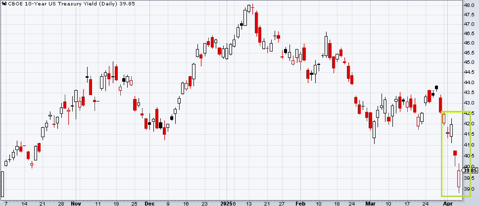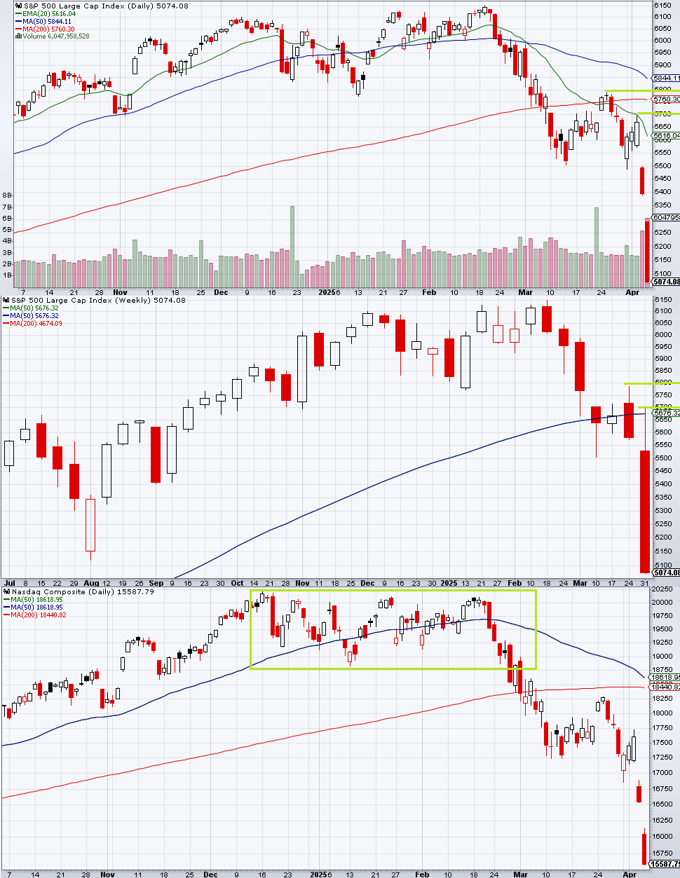 S&P 500は久々に見るブラッドバスになった。月曜3/31は広く予想された通り、月末絡みのテクニカルなフローが錯綜する中で寄り底に近い陽線となり、「解放の日」を前にやることがない火曜4/1、水曜4/2もふわっとした反発になった。「解放の日」は水曜4/2の引け後であり、一律10%の普遍的な関税というヘッドラインが流れた時に一時ショートカバーが走ったが、本丸はその後であり、10%をボトムとする各国向けの「相互関税」が発表されると一転して時間外で暴落した。木曜4/3は下放たれで始まってから続落し、金曜4/4は寄り付き前に中国が報復関税を放り込んできたことで更に大幅続落となった。雇用統計へのヘッジはある程度済んでいたが、そのショートカバーで関税のヘッドラインを跳ね返すには力不足であり、更にパウエル議長が様子見姿勢を芸もなく繰り返したことで下落が加速した。