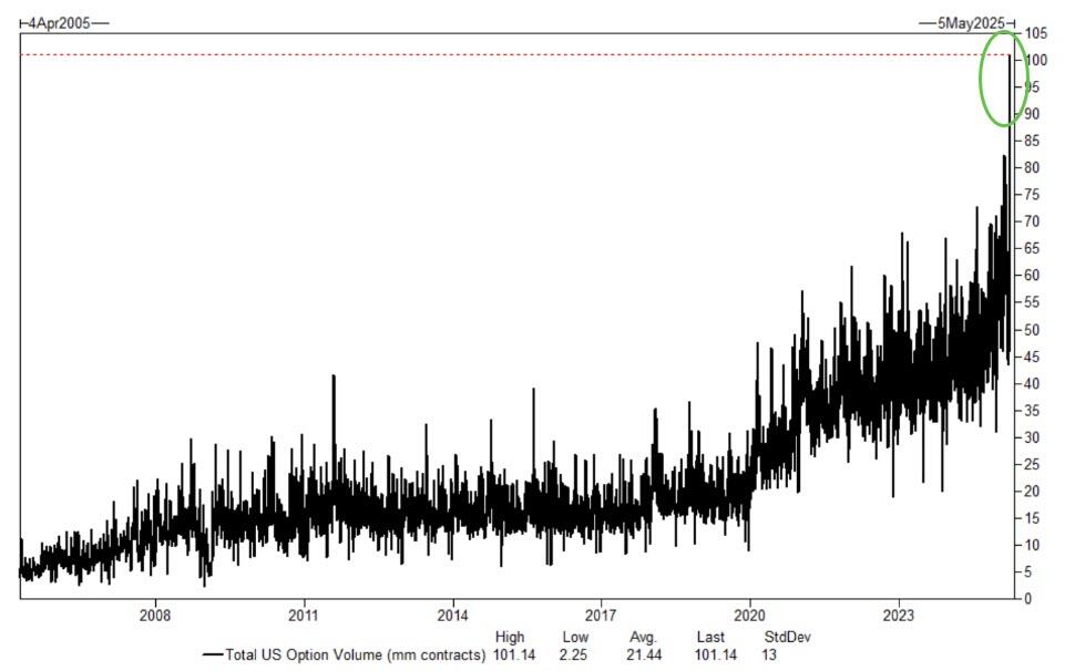 金曜のオプション出来高は空前の規模となった。現物の出来高も同様である。普段なら出来高の急増は出尽くしを意味するが、果たして。