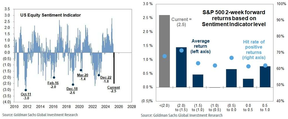 一方、GSのセンチメントインジケーターは過去対比でも総悲観に近付いており、過去の経験では2週リターンが改善する領域に入っている。