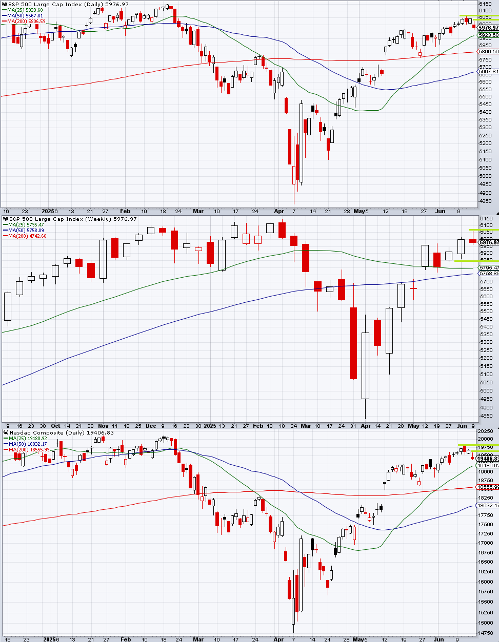 S&P 500はじり高が続いた後に地政学リスクで反落した。月曜6/9、火曜6/10は中国との通商交渉への期待でじり高となり、水曜6/11は警戒されていたCPIが弱めに出たことで一気にゴルディロックスが進みかけたが、イラン関連の地政学リスクの高まりを受けて高値から反落した。もっともその勢いは木曜まで続かず、木曜は再び押し目買いが優勢になった。ここまで、TACOの流行から始まる押し目買いムーブはあまりにも強烈であった。