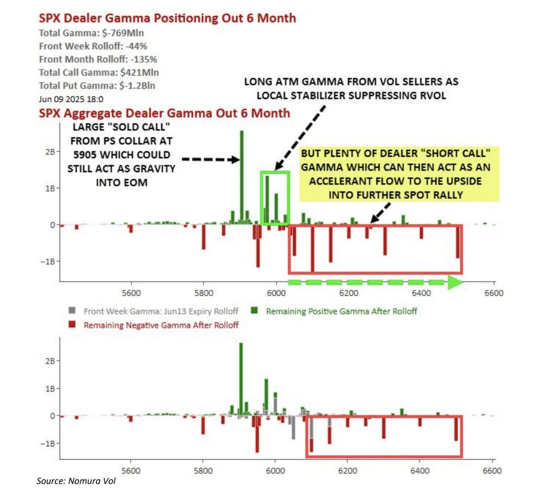 また6月末を満期とするJHEQX(JPMカラー)のコール売りが5905に刺さっており、月末が近付くにつれて野村は「5905に向けた重力」を取り上げている。