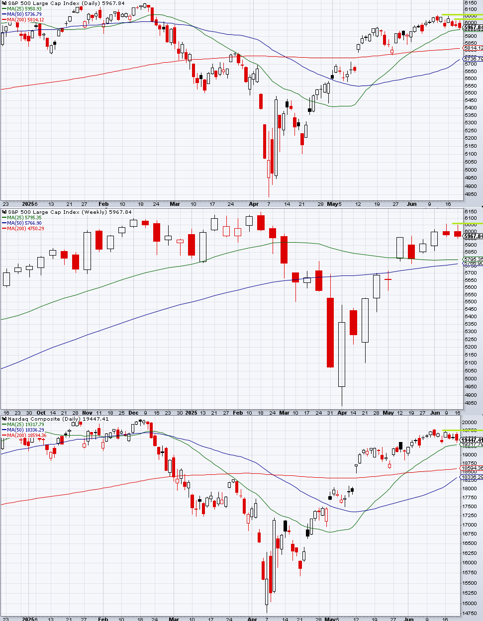 水曜6/18のFOMCにおいてパウエル議長のスタンスが少しタカ派だったことで、S&P 500は終盤にかけて売り込まれた。木曜の休日を挟んで金曜6/20になっても先物は地政学リスクで下値を試し続けたが、トランプがイランに2週間の猶予を与えたことで金曜6/20はショートカバーが先行した。関税のニュースもそうだが、とにかく猶予期間ができるとその期間の長さに耐えられないショートはカバーさせられるものであり、その動きは猶予後の結末を予想したものではない。今後もそうだろう。