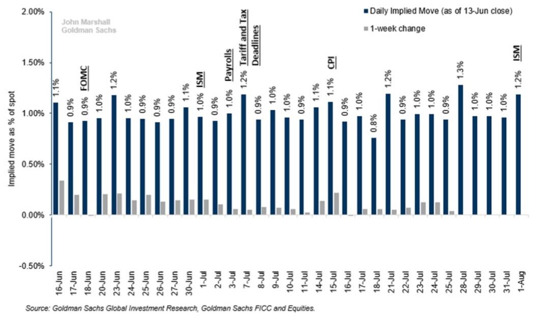 6/13時点の物となるがGSの今後の各営業日のインプライドVolも流れてきており、7月に入ると関税交渉で3ヶ月延期されたデッドラインが近付く7/7に警戒が集まる。