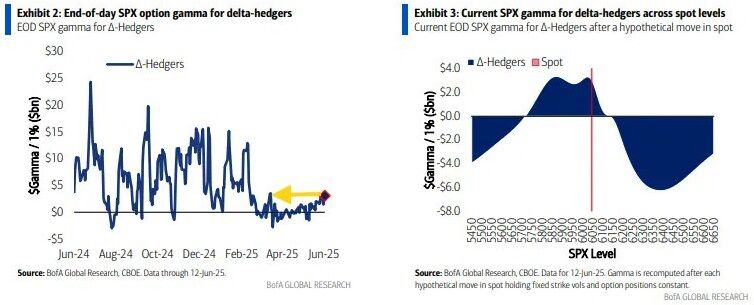 テクニカル。先週の記事では「基本的に5800 -6060レンジ、その内側で作るなら5861 -6026レンジからは逸脱しづらいだろう」としていたが、6026はともかく6060の上限は実に綺麗すぎるほどワークした。よもや「遠くの戦争は買い」の一環である緊張緩和期待で週前半に6060直下で高値を追い掛けた人はいないだろう。週足上ヒゲの6050までレジスタンスが降りて来る。4/24に上方ブレイクされて以来一度も下方ブレイクされていない25SMAは6/20に初めて接近され、これが下方ブレイクされれば5月を中心とするじり高局面の一服を示唆する。5800近辺のポジティブガンマの山が弱まった可能性があるとはいえ、5月後半にも一度サポートになった日足200SMAの5814近辺はテクニカル的にはまだ日足レベルのサポートとして生きている可能性が高く、その下でも日足50SMAの5736が控えている。その上で、機械勢の足を止められる1日2%下げの有無が引続き調整の規模を決定すると考えられ、また日柄がこれだけ明瞭であることから、押し目買いの目安は値幅より(6月末の)日柄ではないか。ショートは停戦方向のヘッドラインに弱いと先週の記事でも述べており、それは現に先週月曜と金曜に見られたが、先週金曜がそうだったように、停戦方向のヘッドラインで既に上がったところは売り場となるだろう。ニュースで買いに転じられるケースがあるとすれば、引続き原油価格の大幅下落が確認できてからである。