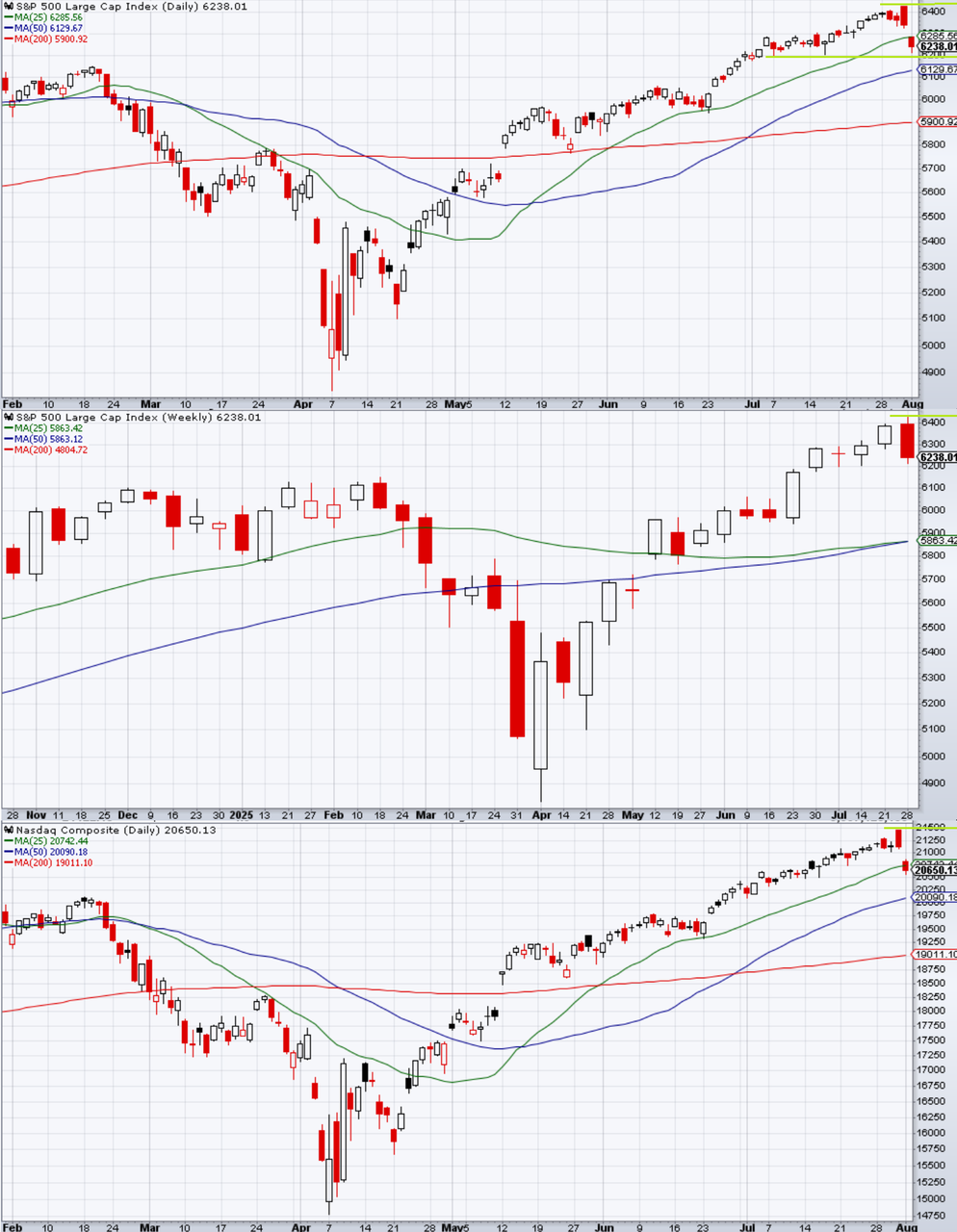 S&P 500は決算が多い週をメガテックの好決算で乗り切ったと思いきや、最後の第二解放の日で思いっきり売られた。もちろん第二解放の日とは言っても通商関連のヘッドラインとはもはや関係ない。四半期国債発行計画もFOMCもゴルディロックス・イベントとはならず、9月利下げ期待も盛り上がらなかったことで水曜7/30に指数は一度大きく売り込まれた。水曜7/30引け後のMSFTとMETAがダブルで好決算を出したところで時間外から指数はすぐに全戻し以上に上昇したが、木曜7/31が寄り付くと一転して時間外よりも低い寄付きからの寄り天となり、終日売り込まれて大陰線となった。このように寄り天の陰線が多かったのがこの週の特徴となる。木曜引け後決算組はアップルが堅調、アマゾンが滑り気味だったが、金曜8/1はそれよりも雇用統計が滑ったことで大荒れになった。では9月利下げ観測が復活してゴルディロックスに移行するかというとISMもまとめて滑ったため、ただの景気減速トレードが続いた。