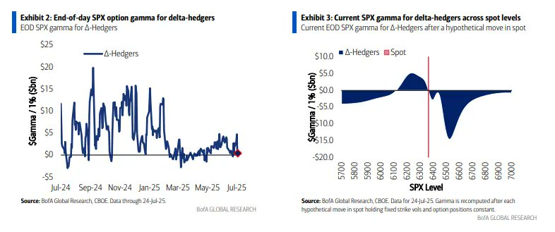 BofAのディーラーガンマは6200台に山があり、これはサポートになると思われるし、現に金曜の下落を受け止めたと思われる。上値の山は消えてしまっており、6400より上はネガティブガンマが続く。殺到するコール買いを相対で取らされていたということか。6200台の山を越えて6100まで割り込むと再びネガティブガンマ域に入るため、レジームが変わりやすいだろう。