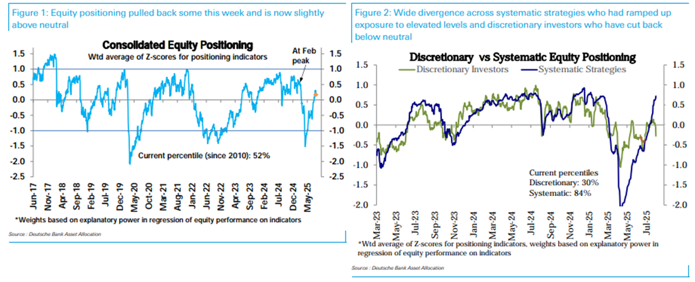 DBのシステマティック勢ポジショニングも、直角で上がってきて天井まであと一歩というところまで来ている。CTAは94パーセンタイルまで膨らんできた。一方、裁量勢は売りに回っている。
