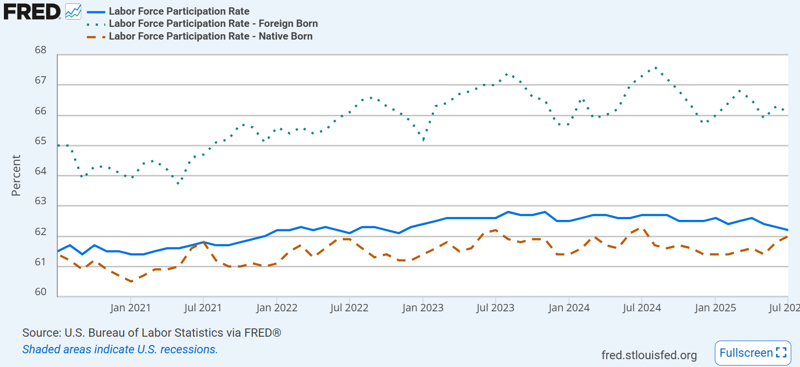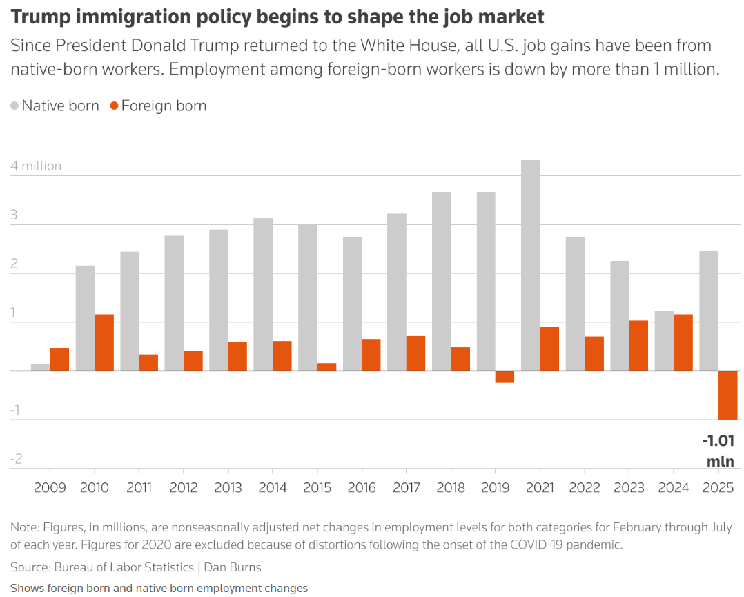 NFPが低調なのに失業率が上がらないのはなぜか。幅広く見られる解釈としては、トランプ政権に移行して以来、移民労働者供給が伸びなくなっているため、供給と需要が同時に減速したというものがある。なぜそれが今目立ち始めるのかというと、不法移民が労働許可を得るのは入国後180日以上経った後だからだという。確かに、民間労働力人口(Civilian labor force)の中の外国生まれ労働者数は2025年春をピークに、バイデン政権の4年間では見られなかったような大幅な低下(ピーク対比で165万人減)を見せている。民間労働力人口の総数が1.7億人程度なので、1%減となる。