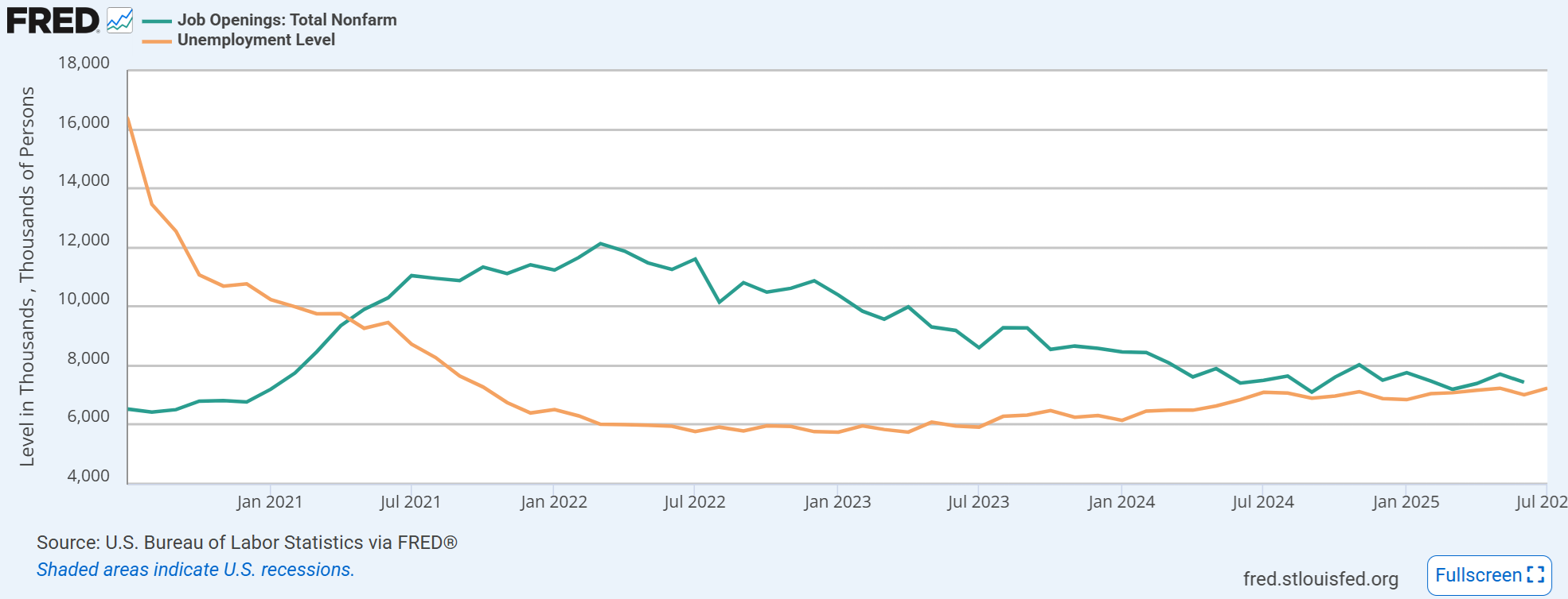 JOLTSと失業者数については昨年の記事では2024年末に交叉すると思っていたが、その後利下げの効果もあってJOLTSの減少が思いのほか鈍かったため、Fedが重視するJOLTS/失業者数比は1倍を目前にホバリングしている。ベバリッジ曲線で言うと平坦化する手前の曲がり角で停滞している。失業者数は粛々と増えており、一方で求人が減らないのは移民減による人手不足感のせいだろう。